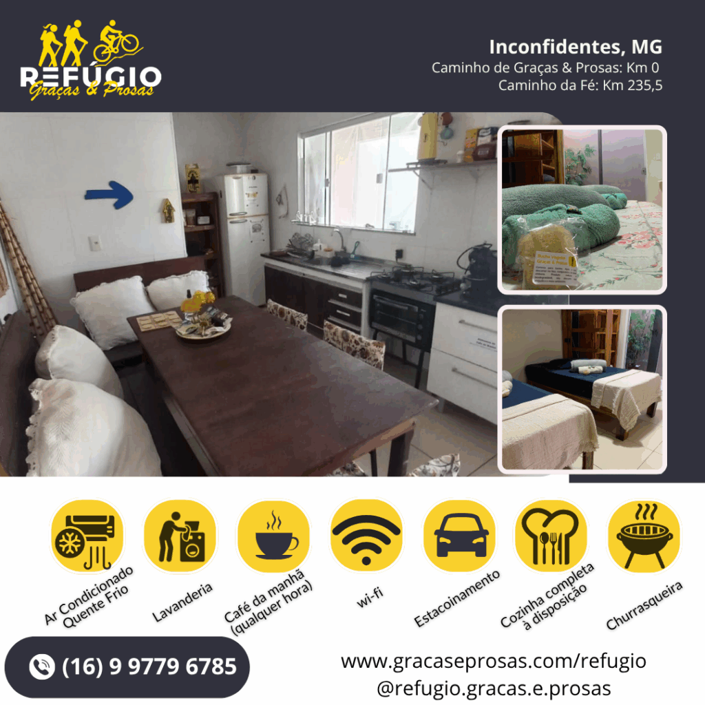 A Pousada Refúgio Graças & Prosas em Inconfidentes é mantenedora do Caminho. Ajude a sustentabilidade do Caminho dando preferência nas reservas em Inconfidentes, MG (ponto inicial oficial do Caminho).
